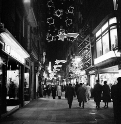 "Carrer Major; vista nocturna amb il·luminació nadalenca; a la dreta es veu la botiga Bellostas Vidal"