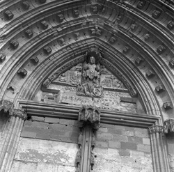 "Vista de detall del timpà i les arquivoltes de la Porta dels Apòstols"