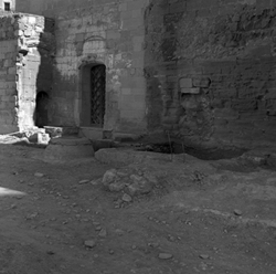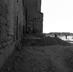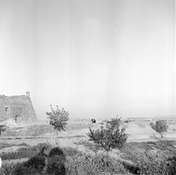 "Vista de l'espai conegut actualment com Plaça de la Sardana, al peu del Baluard de l'Assumpció de les muralles de la Seu Vella; la Porta dels Bernats apareix en obres de neteja per a la seva obertura"