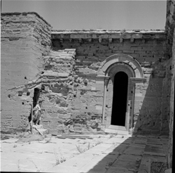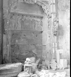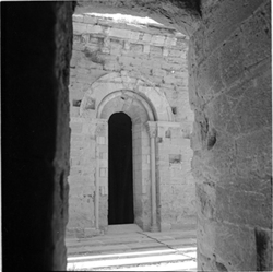 "Vista d’un finestral romànic del mur oest del creuer; a l'esquerra es veu a porta de sortida de l'escala d'accés a les teulades de la catedral"