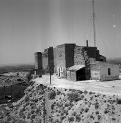 "Vista del Castell de la Suda des de les teulades de la catedral; sobre el mateix es veu l'antena de Ràdio Lleida (E. A. J. 42 RADIO LERIDA), i en primer terme hi ha un cobert amb un camió aparcat"