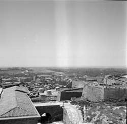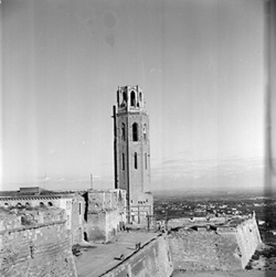 "Vista, des de les teulades de la catedral, del vessant del castell de la Suda i el Baluard del Rei de les muralles de la Seu Vella al fons; a l'esquerra es veu la teulades de la Casa d'Exercicis (Canònica), i al fons la ciutat"