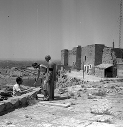 "Vista del Castell de la Suda des de les teulades de la catedral; sobre el mateix es veu l'antena de Ràdio Lleida (E. A. J. 42 RADIO LERIDA), i en primer terme hi ha un cobert amb un camió aparcat; unes persones passegen per la teulada"