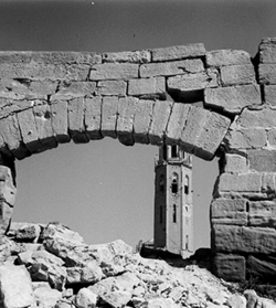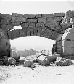 "Arc de les muralles de la Llengua de Serp; vista des de l'exterior amb el campanar al fons"