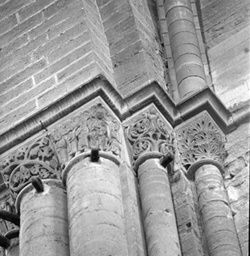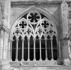 "Vista del finestrals central de l'ala est del claustre de la Seu Vella"