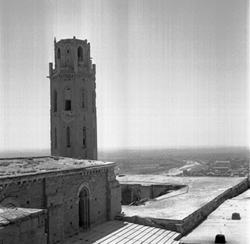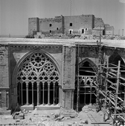 "Vista dels finestrals de l'ala nord des de la teulada del claustre de la Seu Vella, amb bastides per a la reconstrucció de les arcades claustrals; al fons hi ha el castell de la Suda, sobre el que es veu l'antena de Ràdio Lleida (E. A. J. 42 RADIO LERIDA)"