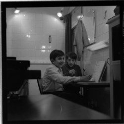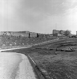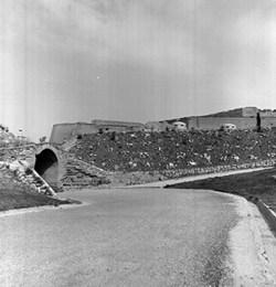 "Vista de la pujada al turó des de la Porta del Lleó a les muralles de la Seu Vella; al fons es veu el Baluard del Rei i sobre la Suda es veu l'antena de Ràdio Lleida (E. A. J. 42 RADIO LERIDA); en primer terme hi ha els jardins, coneguts actualment com de Pompeu Fabra, on a la foto es veu l'escut floral de la ciutat amb el rétol Lleida Terraferma , fet amb flors"