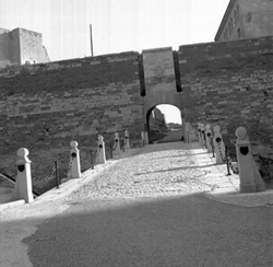 "Vista del pont d’accés a la Porta Principal del castell, a les muralles de la Seu Vella; s’hi ha instal·lat una barana de pedra motllurada amb cadenes; al fons es veuen el castell de la Suda a l'esquerra i a la dreta la Casa d'Exercicis de la Seu Vella (Canònica)"