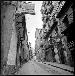 "Carrer Cavallers, a la dreta l’església del Roser i a l’esquerra, el Roser.\nBAR MI CASA i BODEGÓN DOS TRAGOS, davant per davant."