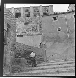 "Carrer Nolius, part alta; al fons els finestrals del claustre de la Seu Vella"