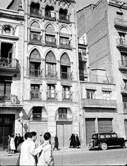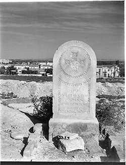 "Monument amb la inscripció CAIDOS POR DIOS Y POR ESPAÑA. PRESENTES! 25 AGOSTO 1936 , situat al Camp de Mart; al fons l’Avinguda Prat de la Riba (aleshores General Mola)."