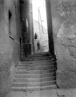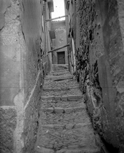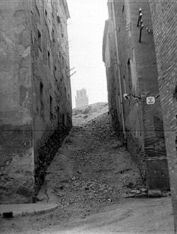 "Escales del Carrer Pleyan de Porta, segons la placa identificativa que es veu al fons, al darrera d’uns edificis apuntalats"