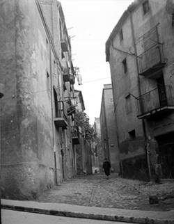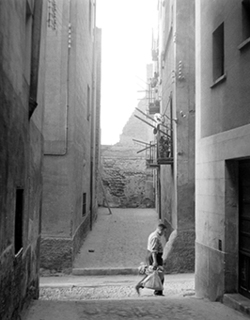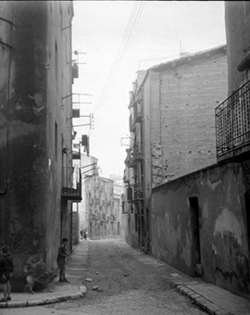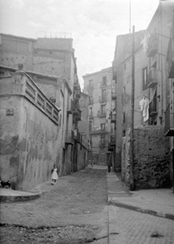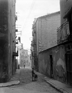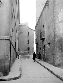 "Carrer Múrcia des de la Plaça del Dipòsit; al fons el Carrer de la Tallada; a la dreta, inici del Carrer Veguer Carcassona; a l’esquerra, una nena petita vestida de diumenge"