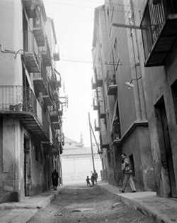 "Carrer Ballester, des del xamfrà amb el Carrer de la Plateria al fons, xamfrà amb el Carrer Canonge González"