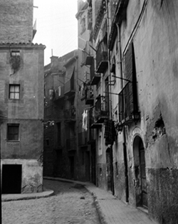 "Carrer de la Font de l'Aiguardent, annex a l’edifici de la Diputació de Lleida, a l’esquerra; al fons el carrer del Carme"