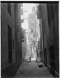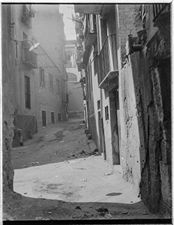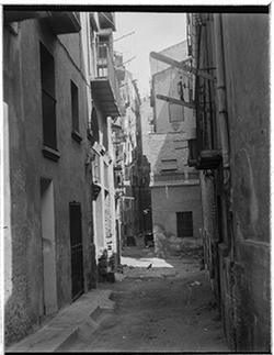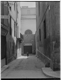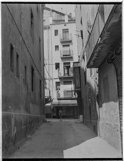 "Carrer de la Font de l'Aiguardent, annex a l’edifici de la Diputació de Lleida, a la dreta; al fons es distingeix un rètol amb la inscripció: Patronato de Apuestas Mutuas Deportivo-Benéficas"