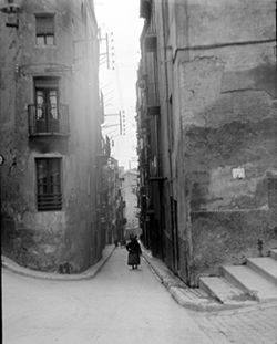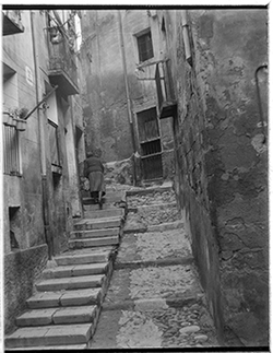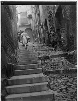 "Escales de la part alta del Carrer de la Parra, amb una dona gran pujant per les mateixes"