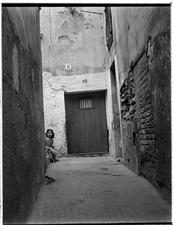 "Un racó del Carrer de la Vileta, possiblement; una nena petita asseguda en un esglaó del carrer"