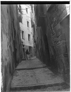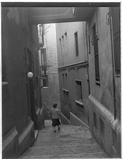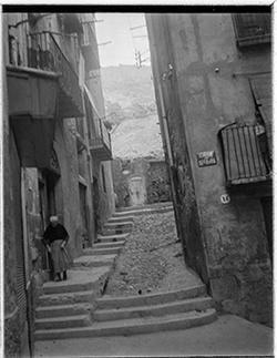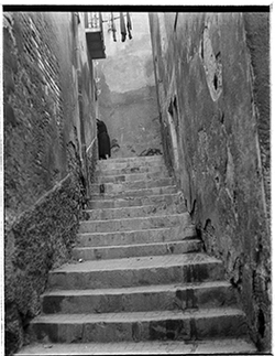 "Escales del Carrer Borràs; a la dreta, xamfrà amb el Carrer de Segarra (segons una placa a la paret); una dona gran baixa les escales"