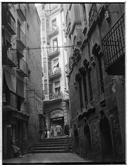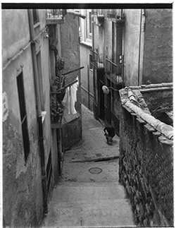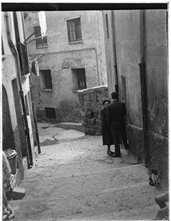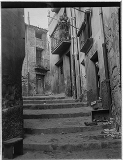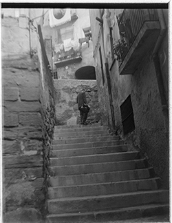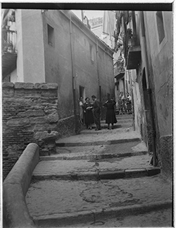 "Escales de la part alta del Carrer de Nolius; a la dreta, una dona jove surt d’una botiga, amb rètol LA VALENCIANA"