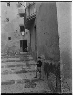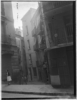 "Carrer Nolius; a la dreta, un nen amb una bossa a les mans, observa la càmera"