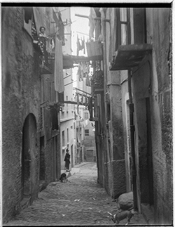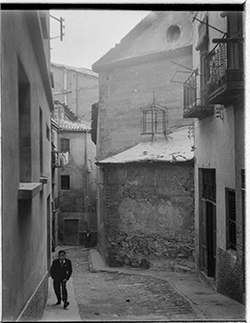 "Carrer dels Dolors; a la dreta, absis de l'església - Oratori dels Dolors; un nen vestit de festa camina pel carrer"