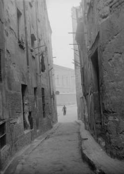 "Carrer del Joglar Segalà; a l’esquerra les ruïnes del Convent de l’Ensenyança"