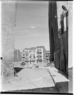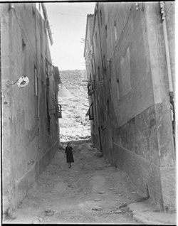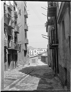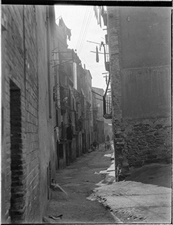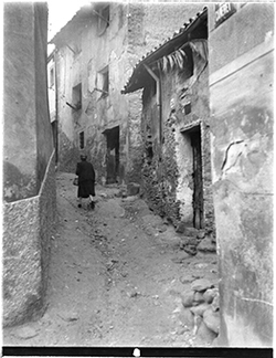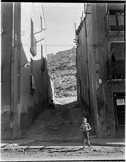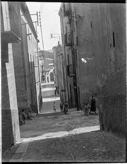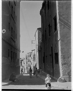 "Carrer Saporta, des del Carrer de Sant Martí; un nen mira la càmera; al fons, el vessant del Turó del la Seu Vella, i els carres Darrera de Sant Martí i Monterrey"