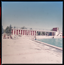 "Parque Municipal Alcalde Pons ; les Basses; porxo annex a la coneguda com piscina Deportiva , amb diversos banyistes"